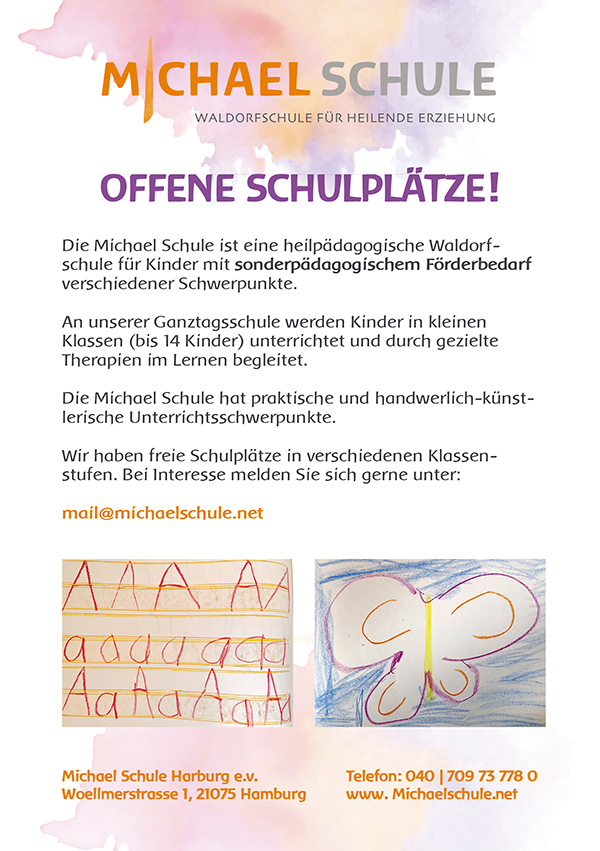 Die Michael Schule ist eine heilpädagogische Waldorfschule, eine Schule für Kinder mit sonderpädagogischem Förderbedarf verschiedener Schwerpunkte. An unserer Ganztagsschule werden Kinder in kleinen Klassen unterstützt und durch gezielte Therapien im Lernen begleitet. Die Michael Schule hat praktische und handwerklich-künstlerische Unterrichtsschwerpunkte. Für das leibliche Wohl bieten wir täglich ein frisch zubereitetes Mittagessen an.